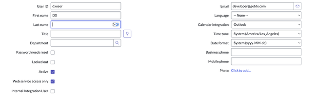 Create a service account in ServiceNow by navigating to Organization > Users and creating a user.