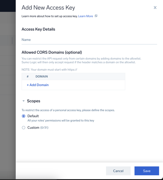 Generate an Access ID and Access Key by navigating Preferences > Personal Access Keys > Add Access Key in Sumo Logic.