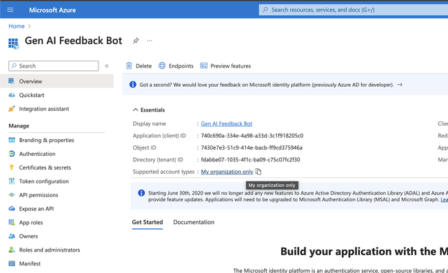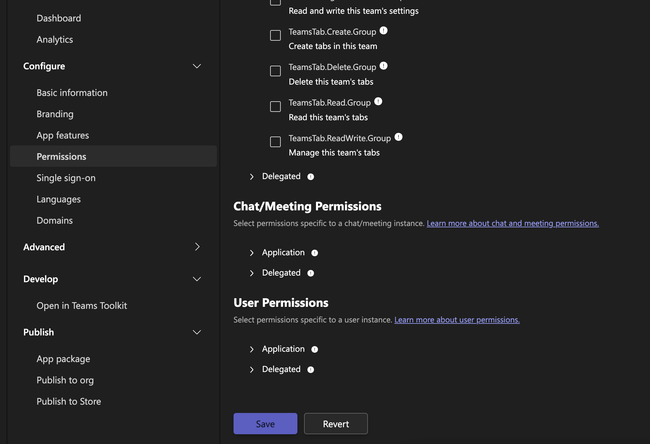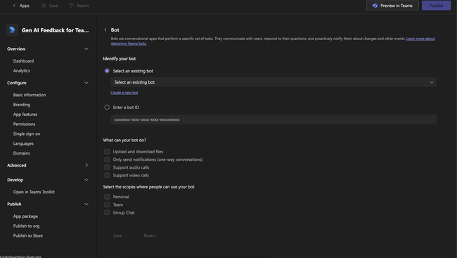 Be sure to scroll to the bottom and hit Save. Then, go to App features in the main navigation and click the Bot tile to configure a bot for your app.