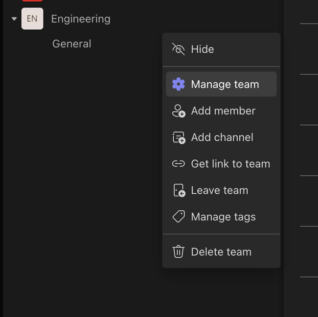Right-click on a team and select Manage team.