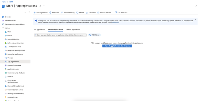 Create an app registration within Microsoft Entra ID by visiting the App registrations page in the main navigation: