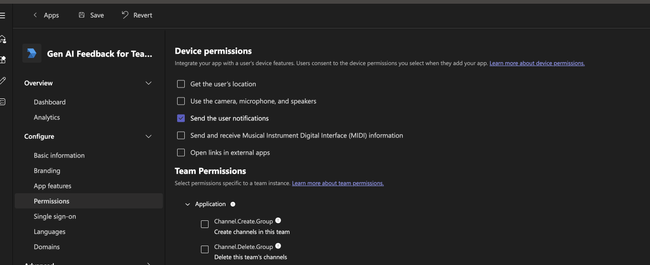 In the left navigation, open Client secrets and click Generate a new secret. Store the secret securely for later. Then, navigate back to Apps on the left and click the Teams app you started creating.