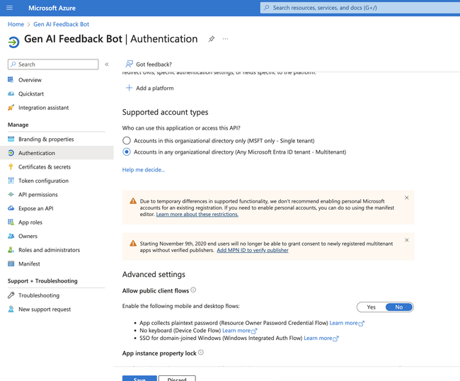 Within Microsoft Entra ID, navigate to your bot and click where it says My organization only under Supported account types.