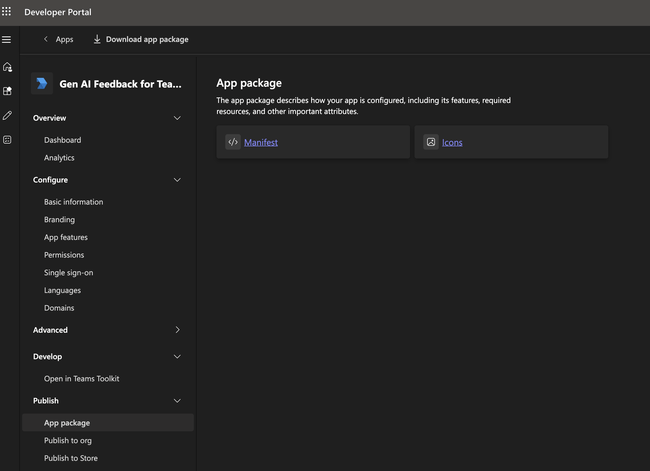 Click Download app package in the top navigation. You should get a ZIP file that consists of the manifest and branding assets (three files).