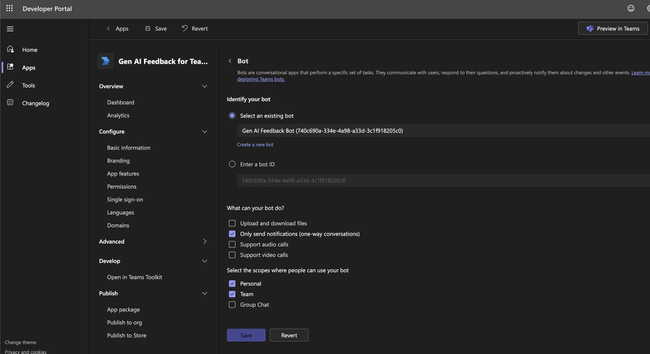 Be sure to scroll to the bottom and hit Save. Then, go to App features in the main navigation and click the Bot tile to configure a bot for your app.