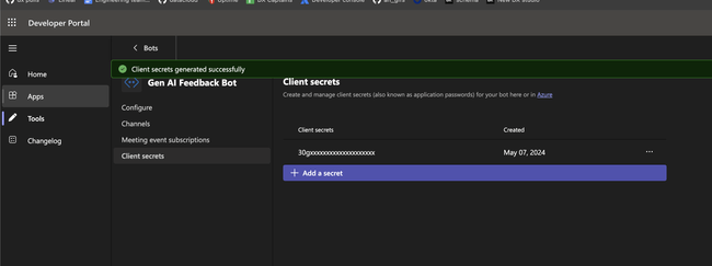 In the left navigation, open Client secrets and click Generate a new secret. Store the secret securely for later. Then, navigate back to Apps on the left and click the Teams app you started creating.