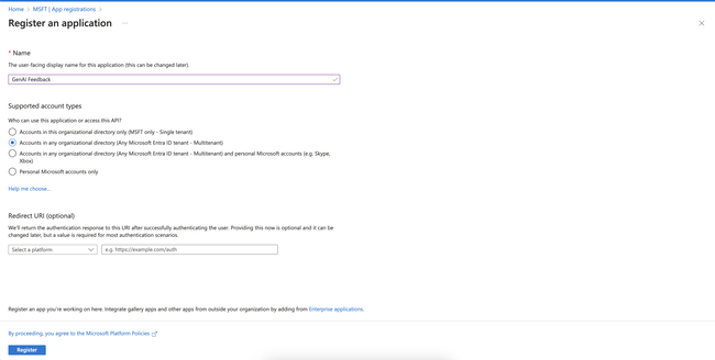 Click New registration and then type a name you’d like for your app. Then, select Multitenant and hit Register.