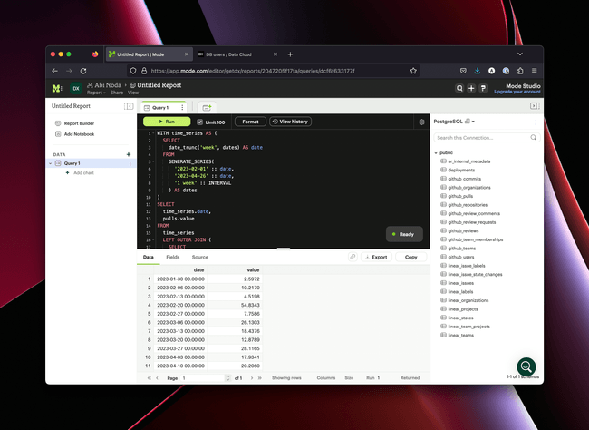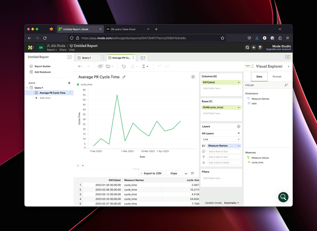 The images below demonstrate connecting to DX from a business intelligence tool (e.g., Mode Analytics) and creating a custom cycle time report using data from the DX data lake.