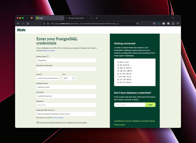 Use a Postgres-compatible database client and connect to the database with the credentials you generated in Step 1. For desktop clients, we recommend Postico and pgAdmin. If your database user was granted the read_write scope, you can create tables in the custom. namespace and write to them.