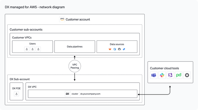 Your DX cluster resides in a private VPC that is peered with your corporate networks and VPCs which contain data sources such as GitHub and GitLab. When needed, your DX cluster may also connect to cloud tools that reside outside of your network.