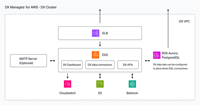 The DX cluster consists of several Kubernetes services that run in AWS EKS. In addition, DX utilizes managed AWS services including RDS, S3, Bedrock, and Aurora. Please see the next section for more details on required AWS services.