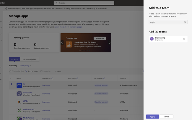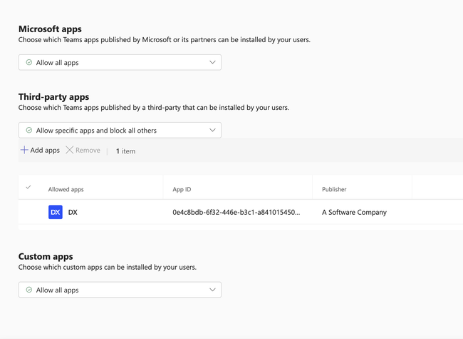 In addition to being installed unto a team, the DX Teams app must be installed for users in order to send messages and notifications. To ensure this, it’s important to verify your App Permission policies as outlined below. Please note that settings updates can take up to five days to propagate, so be sure to work with your DX account representative to ensure full propagation prior to roll-out.