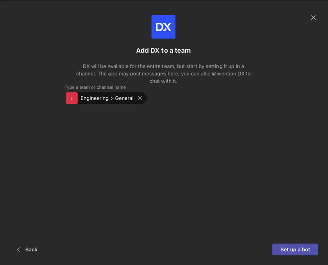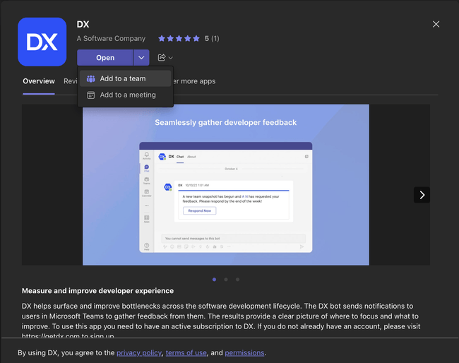 Search for DX in the Microsoft store or open it directly using this link. Click on the dropdown and select “Add to a team”. When the DX Teams app is installed to a team, members of the team will be provisioned in DX as users and be able to sign in to DX using Microsoft SSO.