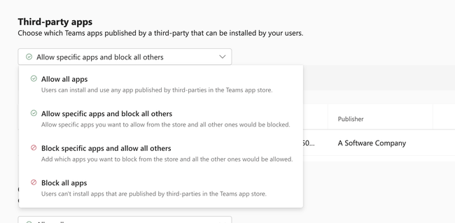The first screenshot below lists the options available in Microsoft Teams, and the second screenshow displays an example of selecting the option “Allow Specific Apps and block all others”.