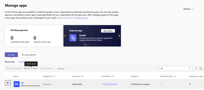 To install the DX MS Teams app, search for DX in the Microsoft store or open it directly using this link. Then, click on the dropdown beside the installation button and select “Add to a team”: