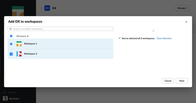 Once your installation is complete, you’ll be redirected back to your Slack Enterprise Grid dashboard to select which workspaces to install DX to: