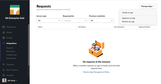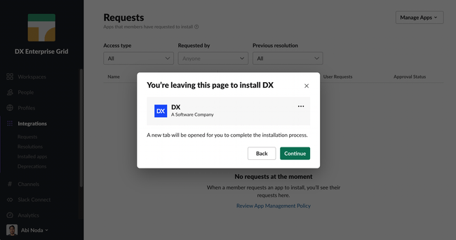 To install DX for Slack Enterprise Grid, go to your Slack Enterprise Grid dashboard and navigate to “Integrations” → “Manage Apps” → “Install an app”.